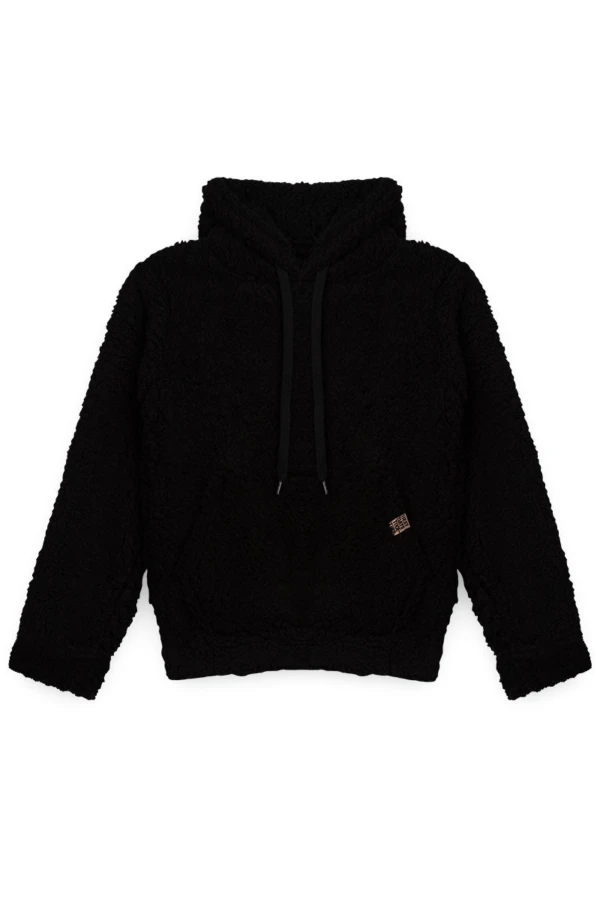 Casaco sherpa forrado 100% poliéster na cor preto com bolso frontal canguru, e capuz com cadarço para deixar super quentinho.