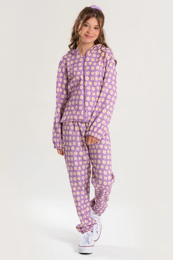 Conjunto em moletom 64% poliéster e 36% algodão. Jaqueta na cor lilás com estampa rotativa, zíper e capuz. Calça na mesma cor e estampa com cadarço decorativo.